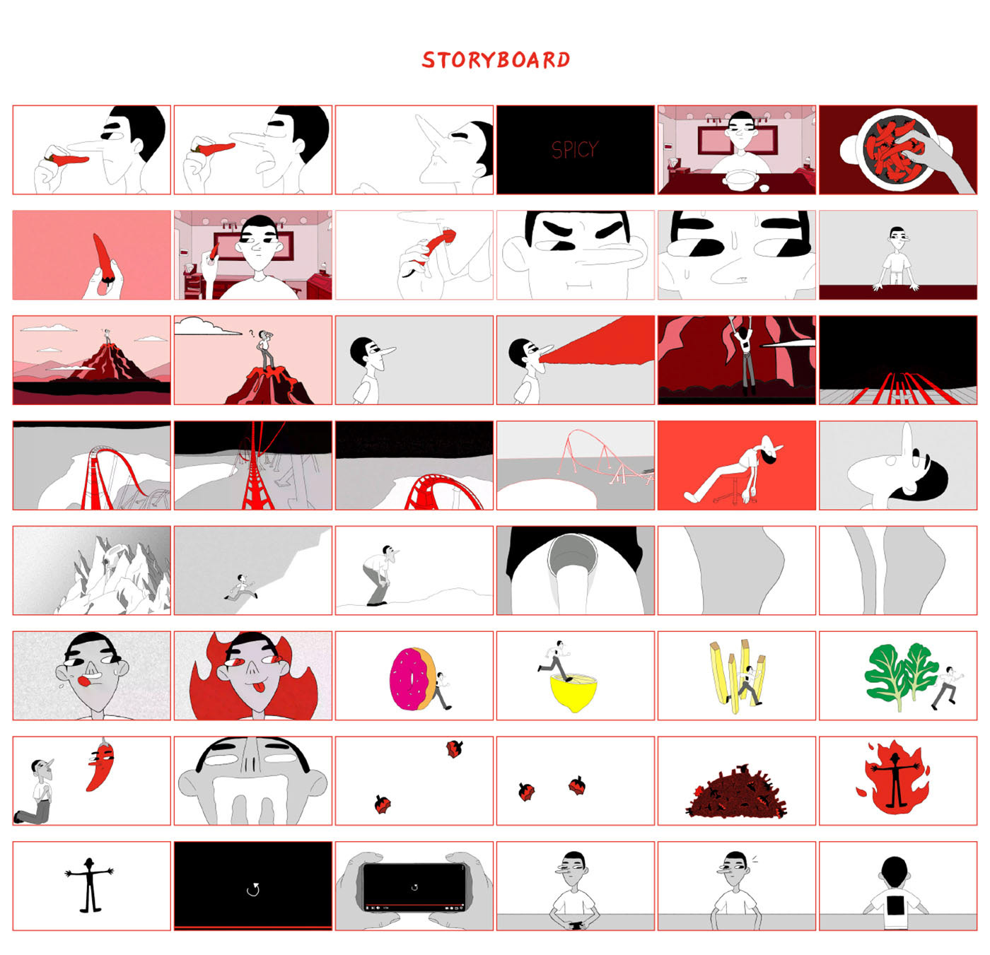 스토리 보드는 레드 컬러의 포인트로 매운 맛을 표현하고 느끼는 감정들을 화산, 롤러코스터, 불 등을 통해 시각적으로 담아내려고 했습니다.